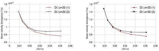 Mean velocity divergence of flow domain versus dimensionless time step size.
