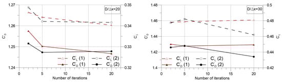 Mean drag and lift coefficients versus number of iterations per time step.