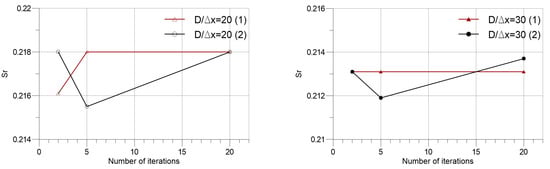 Strouhal number versus number of iterations per time step.