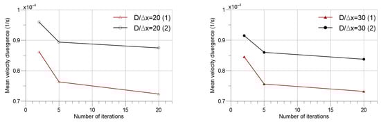 Mean velocity divergence of flow domain versus number of iterations per time step.