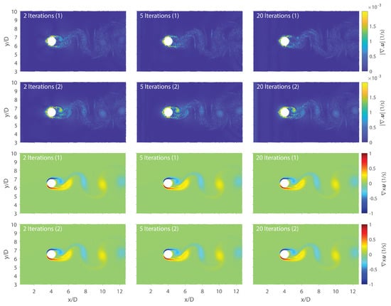 Figure 3 shows the values of mean drag and lift coefficients varying with the dimensionless time step sizes (). Algorithms 1 and 2 are in tune with each other, as it can be seen from both and results. As for the kinematics, periodic vortex shedding characteristics are compared over Strouhal number "” versus dimensionless time step size in Figure 4, where , with f being vortex shedding frequency in Hz. Similarly, Algorithms 1 and 2 yield coherent results in this aspect. The noticeable difference between the force coefficient values for and indicates that cannot provide a sufficient particle resolution. Yet, it can be inferred from Figure 5 that the mean velocity divergence, hence the continuity error, is comparable for these two particle resolutions. Figure 5 also indicates that increasing the time step sizes results in a better achievement of overall incompressibility in the domain. This is due to the fact that, since the time step size is a term in the penalty coefficient as , the larger the time step size, the larger is the penalty coefficient, which affects the iterative guesses of the intermediate velocity field and the pressure field through Equations (8) and (10), respectively. Consequently, the penalty coefficient naturally influences the convergence characteristics of the iterative process. It should be stated that for simulations with five iterations per time step, the utilization of the time step beyond the maximum value that is represented in Figure 5 yields diverging simulations for both particle resolutions and both algorithms. Algorithms 1 and 2 show generally similar trend with increasing time step sizes. However, Algorithm 1 performs slightly better than Algorithm 2 in larger time step sizes.