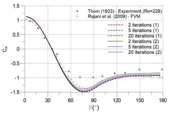 In Figure 10, pressure coefficients for Algorithms 1 and 2 with two, five, and 20 iterations are compared over the simulations with . The results of for the Algorithm 1 are unaffected by the number of iterations per time step, yielding overlapping mean pressure coefficients along the cylinder surface. Additionally, the differences between the results of Algorithms 1 and 2 are trivial for a kind of flow characteristic, which is fairly unsteady. It can be noticed that the mean drag and lift coefficient results of resolution in Figure 6 also support the findings of pressure coefficients, since they both demonstrate almost insensitive responses to the number of iterations per time step for Algorithm 1. The finite volume method results of Rajani et al. [] and experimental results of Thom [] are also included in this comparison to present supplementary information.