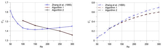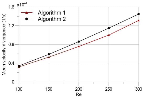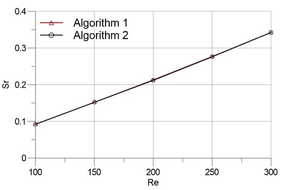 In Figure 11, the mean drag and lift coefficients against Reynolds numbers are presented. It can be observed that both and series are almost identical. Higher particle resolutions are required with increasing Reynolds numbers, which can be inferred through comparing the results of the current study with that of Zhang et al. based on the finite difference approach []. Moreover, the Strouhal number results of the two algorithms at different Reynolds numbers are compared in Figure 12. Correspondingly to the results of force coefficients (Figure 11), the Strouhal number results of Algorithms 1 and 2 match with each other. The mean velocity divergences of the flow fields display similar behaviour with the overall outlook of the results that were classified in the previous subsection. Figure 13 shows that Algorithm 1 produces slightly lower mean velocity divergence in the flow domain at all Reynolds numbers covered.