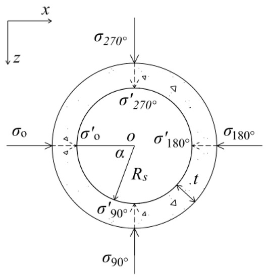 Figure 2 shows the stress reduction model of the stress transfer through the grouting ring. Four points at an angle of 0, 90, 180, and 270° on the full circle grouting ring are considered to calculate the degree of reduction in the additional stress. We assume that the additional stress at the four points is indicated by , , , and , and the corresponding points of the application coordinates are (x0, y0, z0), (x1, y1, z1), (x2, y2, z2), and (x3, y3, z3). The additional stress acting on the inner surface of the grouting after the stress is transferred through the grouting ring and reduced by it is denoted by , , , and respectively, and the corresponding points of the application coordinates are (x0′, y0′, z0′), (x1′, y1′, z1′), (x2′, y2′, z2′), and (x3′, y3′, z3′). t and Rs represent the thickness of the grouting ring and the inner radius of the grouting ring, that is the radius of the existing tunnel, respectively.