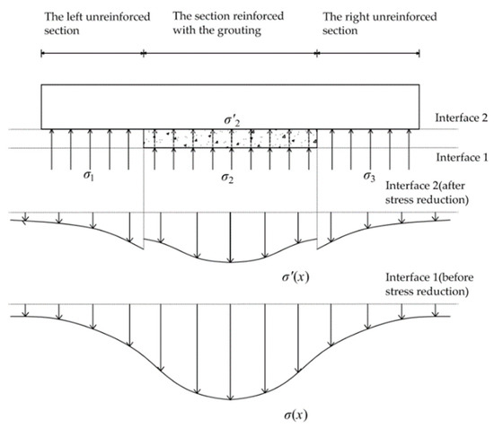 As shown in Figure 3, the reinforcement range of the grouting ring along the longitudinal direction of the tunnel is limited. The middle section of the existing tunnel is the reinforcement area of the grouting ring, and there is no protection by the reinforcing grouting ring at the far ends on both sides of the crossing center. At the height of interface 1 below the existing tunnel, the additional stress on the soil caused by the tunneling shield is not affected by the local reduction of the grouting ring, and the overall stress (σ(x)) curve shows a normal distribution along the longitudinal direction of the tunnel. When the additional stress is transferred from interface 1 into interface 2, the reduction in the additional stress will be greater when transferring through the grouted soil than through the general soft soil. The overall stress (σ′(x)) will have a greater degree of stress reduction in the section reinforced with the grouting, so a sudden change of stress appears at the edge of the section reinforced with the grouting.