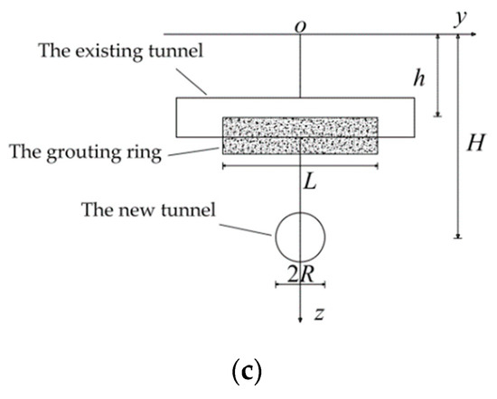 To address the above issues, a number of scholars have conducted relevant research through numerical simulation [4,5], measured data analysis [6,7], theoretical analysis [8,9], and indoor model tests [10]. There are many types of protection measures for existing tunnels. One of the effective methods is to use the grouting hole on the segment of the existing tunnels to insert a grouting pipe for grouting behind the wall of the tunnel. A large number of projects have adopted this technology and achieved good results [11,12,13]. At present, the research on the grouting technology in caves chiefly focuses on the verification of the effect of grouting rings on controlling the settlement of the existing tunnel. In practice, however, a variety of control techniques are often used to control the deformation of existing tunnels at the same time, so the effect of post-grouting on controlling the settlement of existing tunnels is superimposed on the impact of other control measures. Currently, there is no study on the effect of the grouting behind the wall of tunnels. In addition, there is no theoretical calculation method to examine the effect of the grouting rings on controlling the settlement of the existing tunnels. Therefore, it is necessary to develop a mechanical model of old and new tunnels under the influence of grouting rings and develop a theoretical method to study the effect of grouting rings on controlling the vertical deformation of existing tunnels.