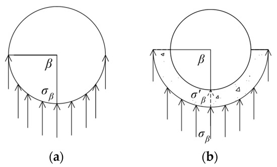 As shown in Figure 6a, when solving the additional stress on the reinforced section of the non-grouting ring, we assume that the vertical additional stress acting on the lower semicircle of the segment is σβ, and the angle between the connecting point of action and the horizontal radius is β (0 ≤ β ≤ 180°); then, the coordinates of the calculated points should satisfy: