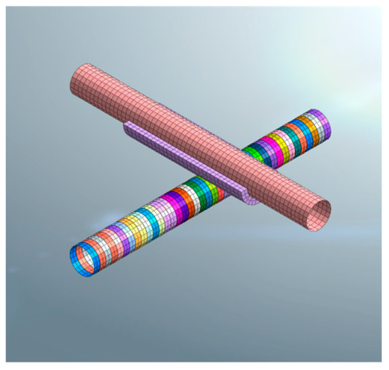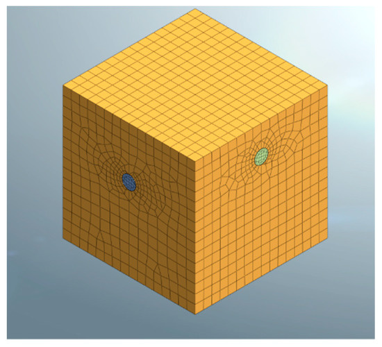 The 3D finite element model is built using MIDAS GTS NX software in combination with the working conditions of the calculation example. In order to verify the reliability of the calculation method proposed in this work, the parameters involved in the finite element model are the same as those used in the theoretical calculation examples. Figure 7 and Figure 8 illustrate the meshing diagram and a schematic of the model of the traversing tunneling shield, respectively. The tunnel model and the soil are both considered to be solid units, and the length, width, and height of the calculation model are 66, 66, and 66 m, respectively.