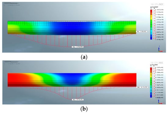 The shield excavation face was set at x = 50 m. Figure 9 shows the cloud diagram of the tunnel displacement computed by the finite element model before and after setting up the grouting ring.