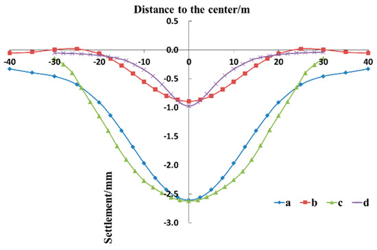 Comparison of tunnel settlement curves: (a) data computed by the calculation method proposed in this paper when no grouting ring is set, (b) data computed by the calculation method proposed in this paper when a grouting ring is set, (c) data computed by the finite element model when no grouting ring is set, and (d) data computed by the finite element model when a grouting ring is set.