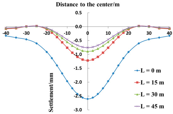 Figure 11 shows the comparison between the vertical displacement curves of the existing tunnel at different lengths of the grouting section. It is obvious that, first, in the main settlement area near the crossing center, the settlement curves have a normal distribution under all the working conditions, and the maximum settlement of the existing tunnel occurs in the crossing center. When L is 0, 15, 30, and 45 m, the maximum central settlement is equal to 2.61, 1.22, 0.89, and 0.76 mm, respectively. Second, the installation of the grouting ring can effectively reduce the settlement of the existing tunnel, but as the length of the grouting section increases, the reinforcing effect will gradually weaken. This indicates that the chiefly affected area of the existing tunnel is near the crossing center, under which the new tunnel passes, so setting the grouting ring for the insignificantly impacted areas will reduce the cost-effectiveness of the grouting ring protection method.