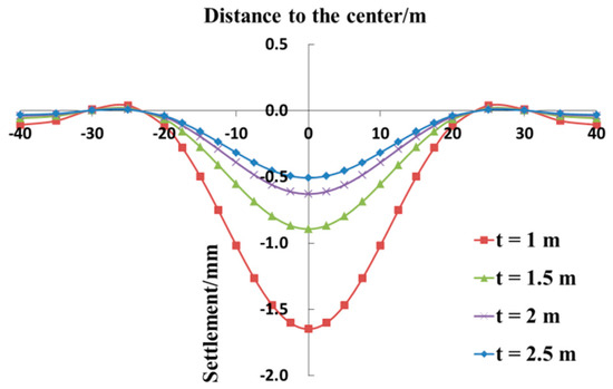 Figure 12 depicts the comparison between the vertical displacement curves of the existing tunnels at different thicknesses of the grouting ring. First, as the thickness of the grouting ring increases, the settlement value of the existing tunnel decreases continuously. When t is equal to 1.0, 1.5, 2.0, and 2.5 m, the maximum settlement in the center of the existing tunnel is 1.65, 0.89, 0.63, and 0.51 mm, respectively. Second, an increase in the thickness of the grouting ring can strengthen the protective effect and can reduce the settlement of the existing tunnel, but it increases the cost of protection gradually. Third, the variation in the thickness of the grouting ring has a negligible effect on the settlement range of the existing tunnel, and the chiefly impacted section is always within 20 m from both sides of the center of the existing tunnel.