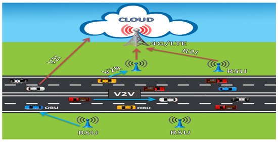 - On-Board Unit (OBU): Each vehicle is equipped with an OBU to collect its information, such as the position, speed, and acceleration/deceleration, and transmits it to vehicles or RSUs within its transmission range through the wireless medium. As stated in Reference [24], “it uses the Wireless Access in Vehicular Environment (WAVE) standard, which is based on the emerging IEEE 802.11p specification”.