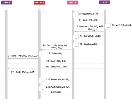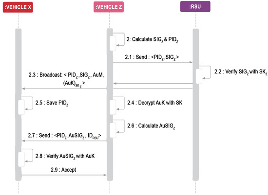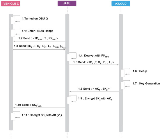 Each vehicle must register itself at the nearest RSU, and the RSU then transmits vehicles’ information to the cloud for keys generation and for updating vehicles’ information as shown in Algorithm 1. The registration mechanism has three steps, and Figure 2 describes the sequence diagram of the registration process.