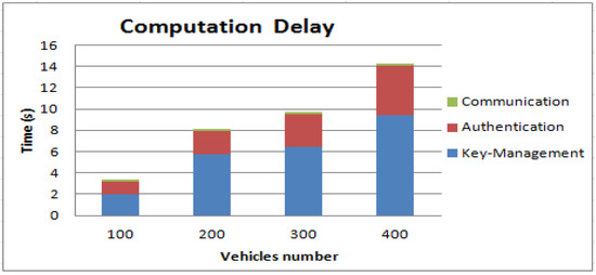 We notice that the delay increases when the number of vehicles increases. This is due to the number of vehicles that calculate their authentication and their key distribution. The key-management step contributes almost 59% of the computation delay to generate vehicles’ keys and distribute them in a secure manner (using CP-ABE algorithm). The computation delay in authentication step requires almost 40% to authenticate vehicles and to distribute authentication key.