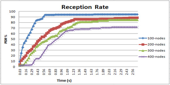 Figure 8 shows the comparison of PDR according to the number of vehicles. The results show that the PDR is inversely proportional to the number of vehicles. This is due to the number of vehicles that need key generation, authentication, messages encryption, and decryption, which require a significant computation time. This latter and the high vehicle’s mobility lead to the loss of messages that represents 9% of the transmitted messages. The reception rate for 100 nodes is 95%, 200 nodes is 89%, 300 nodes is 85%, and 400 nodes is approximately 80%.