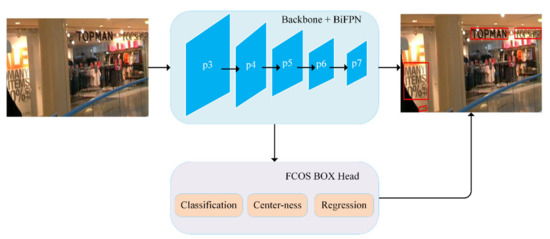 Architecture of the proposed fully convolutional one-stage (FCOS)-based text detector, compromising a backbone, bidirectional feature pyramid network (BiFPN) and FCOS box head for text detection.