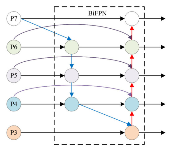 Mainstream text detection architectures employ pyramid feature combination steps (e.g., feature pyramid network (FPN)) to enrich features with high-level semantic information. The traditional FPN generally enriches the feature maps from the final output of a single path architecture in a top-down manner. Despite their great success, such methods are limited by several factors: (1) the design does not incorporate high-level context with the former level features, retaining the spatial detail and semantic information in the network path. (2) Input features vary with resolution, resulting in inconsistent contributions to the output feature. Tan et al. [37] recently proposed a bidirectional pyramid network (BiFPN) that fused multiscale features for object detection. The framework contained two key modules: cross-scale connections and weighted feature fusion. Unlike the one-way information flow of the traditional top-down FPN, BiFPN included a bottom-up path aggregation network and an additional edge from the original input to the output node. We employed five levels of feature maps defined as {P3, P4, P5, P6, P7} (Figure 2), with each feature level P3, P4, P5, P6, and P7 having 8, 16, 32, 64, and 128 strides, respectively.