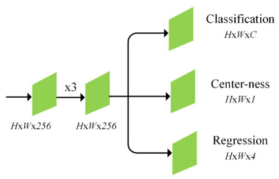 After the execution of the feature extraction backbone, the anchor-free text detection head predicted the text location in the images of nature. Figure 4 presents the network architecture of the text box detection network. Similar to [40], the input features of the backbone network were fed into the three convolutional layers for the final text/nontext classification and the quadrilateral bounding box regression branches. Note that the proposed method has at least 9× fewer network output variables than popular anchor-based text detectors [1,3] that use preset anchor boxes. Following [22], we also employed the centerless branch to eliminate low-quality text prediction bounding boxes.