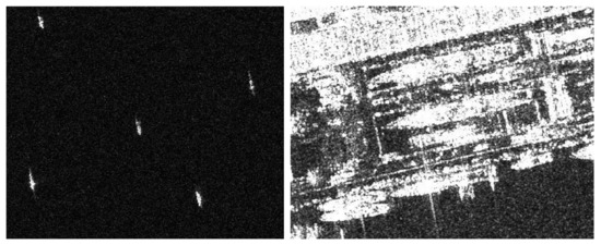 Examples of ship in remote sensing image. The samples are from the SAR ship detection dataset (SSDD) dataset. Left side is the description of the sample under multiobject condition; right side is the description of the sample in complex background.