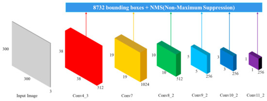 SSD is composed of VGG and extra feature layer. As shown in Figure 2, there are six feature layers to perform a prediction, of which Conv4_3 is from Visual Geometry Group Network (VGG), the remaining five feature layers are added on the base of VGG.