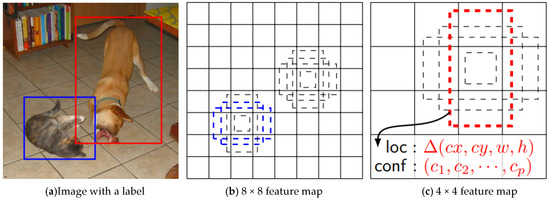 During prediction, each feature map will produce default boxes with different scale. Figure 3b,c show feature maps of different scales. Each feature map is divided into several grids. (b) and (c) are divided into 64 and 16 grids, respectively. While predicting, the grid will generate several default boxes with different scales. As the proportion of default boxes accounted for in (b) is much smaller than that of (c), the default boxes in (b) can easily cover small scale objects. With the increase of network layers depth, the scale of feature maps will gradually become small. As a result, shallow feature maps can predict small objects precisely, and deep feature maps can predict large objects precisely, which is called multiscale prediction in SSD. The default boxes will further adjust the scale according to the loss function to generate the outputting prediction box.