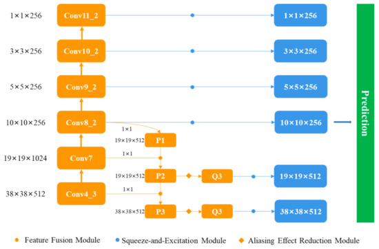 Based on SSD, we add some improvements including introducing attention mechanism and feature fusion module. The overall structure we improved is shown in Figure 4. Firstly, we add a feature pyramid network to SSD, introducing context information to Conv4_3 and Conv7 which are large scale feature maps and are responsible for detection of small objects. Then, in order to improve the ability of feature extraction and raise the significant channel-wise feature as well as reduce insignificant channel-wise feature, a SE module is added.