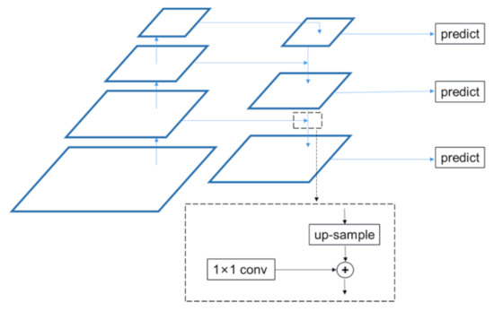 Feature pyramid network (FPN) can fully connect the information of different scale feature maps, balancing special information and semantic information of each feature map. As is shown in Figure 5, FPN is composed of three parts: down-top part, top-down part and connection part. Down-top part is the forward propagation of CNN, during which semantic information will be gradually enhanced. The top-down part is the upsampling process; the size of upper feature map will be doubled by the method of bilinear. In order to solve the problem that the channels of connected feature maps are different, there will be a 1 × 1 conv operation to ensure that the channels of different feature maps are consistent before the connection with upper feature map. Then, two feature maps with the same size and channel will be connected; the connected method is element-wise sum.