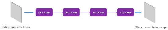 We add this feature fusion module to Conv4_3 and Conv7. As Conv7 will be introduced the information of Conv8_2, Conv8_2 will also be pretreated. In the preprocess of pretreatment, the channel of each source layer will be changed by conv 1 × 1. Then, bilinear interpolation is used to resize two different feature maps to the same size. Particularly, in order to reduce the amount of calculation, we set the channel of Conv7 from 1024 to 512. In the process of feature fusion, different feature maps have different characteristics. As a result, the element-wise sum of feature maps will result in the aliasing effect, reducing detection accuracy. As shown in Figure 6, we proposed an aliasing effect reduction module, removing extra information.