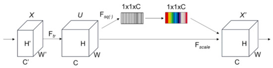 In the field of computer vision, attention mechanism is weight allocation mechanism. The weights that are originally evenly allocated will be redistributed according to the importance of each weight. The important weights are given more values, and the unimportant weights are given less values. As a kind of attention mechanism, Squeeze-and-Excitation Networks (SENet) judges the importance of channel by considering the relationship between channels. The architecture of SE module is as shown in Figure 7. is a transfer function mapping the input to the feature maps (). SE module is added to recalibrate the feature. The features are firstly performed by a squeeze operation, a channel descriptor will be generated suppress the spatial dimensions (H × W) to 1 × 1. The descriptor can reweight distribution of channel-wise feature. Then an excitation operation will be performed, engendering a weight matrix with dimension is 1 × 1 × C. These weights in the weight matrix will be applied to the feature maps to recalibrate the feature.