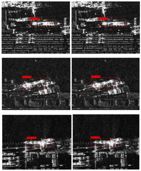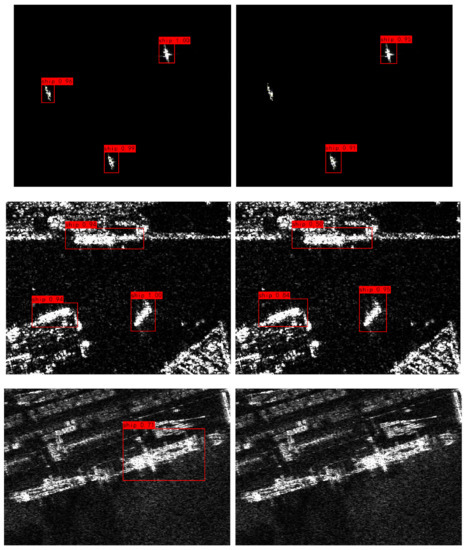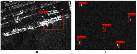 Detection results of SSDD dataset. (a) represents detection result in complex background and (b) represents detection results under multiobject condition.