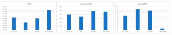 We also compare detection results between our model and other state-of-art object detection algorithms. The parameters for comparison include mAP, memory and detection speed. The comparison of experimental results is as shown in Table 5 and Figure 11. As Faster R-CNN belongs to two-stage algorithms, it has the highest detection accuracy among these models and lowest detection speed, which is hard to practically apply. Our model has the second highest detection accuracy, which is 2.34% and 0.41% higher than SSD and YOLOV4. As we add feature fusion module and SE module, the model size and floating point operations per second (FLOPs) will be increased. As a result, our model’s memory is 174 MB and detection speed is 31 FPS, which can also meet the requirements of real-time detection.