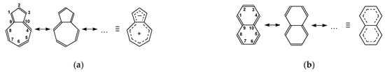 Similar to its valence isomer naphthalene, azulene contains two rings and 10 delocalized π-electrons (Figure 1). These rings, however, consist of a different number of C atoms [25]. In azulene, five-membered cyclopentadiene is structurally fused with seven-membered cycloheptatriene, whereas in naphthalene, two six-membered benzene fragments are structurally fused together. Consequently, the two isomers have not only different structures but also exhibit different physicochemical properties [1,25,26,27,28]. For example, naphthalene is a non-polar and colorless compound, while azulene is a polar and dark blue substance. The large dipole moment of azulene can be explained by the Hückel molecular orbital theory [26]. Because of its high polarity and polarizability, azulene exhibits higher proton and lithium-cation basicity in the gas phase than naphthalene [27,28]. Its gas-phase acidity is also stronger than that of its isomer [27]. Moreover, naphthalene mainly gives products of electrophilic substitution, except for some particular derivatives, whereas azulene can react with both electrophiles and nucleophiles [29,30].