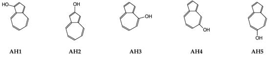 To our knowledge, there are no data on keto-enol equilibria for hydroxyazulenes in the gas phase and aqueous solution. Taking the experimental NMR and IR results for some derivatives into account [31,32,33,34], we applied here quantum-chemical methods to isolated and hydrated azulenes containing one OH group at 1-, 2-, 4-, 5-, and 6-position (AH1–AH5, given in Figure 2). In this way, the stability and bond lengths alternation of enol rotamers and of all possible keto tautomers for AH1–AH5 could be analyzed in detail, and the structures indicated for favored isomers that mainly consist of tautomeric mixtures in two extreme environments, vacuo and water. For estimation of their acid-base strength, the corresponding conjugate anions (A−1–A−5) have also been considered, and thermochemistry of deprotonation-protonation reaction (AH ⇄A− + H+) investigated for individual isomers as well as for isomeric mixtures. Since pKa of some azulenols have been reported [32], their acidities have been estimated in the gas phase and compared with those of phenol and naphthols.