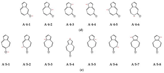 The potential resonance structures for anions of hydroxyazulenes: A−1 (a), A−2 (b), A−3 (c), A−4 (d), and A−5 (e).