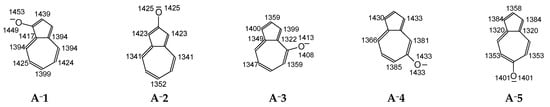 The other HOMED indices (Figure 7), HOMED7 (0.81–0.88) for the cycloheptatriene ring (seven bonds) and HOMED11s (0.81–0.89) for the azulene skeleton (11 bonds), do not vary so much as HOMED5s when compared to those for the parent system azulene (0.87 and 0.91, respectively, in Figure 6). Generally, they slightly decrease for anions. The HOMED12 indices estimated for the entire molecules, including the CO bond (12 bonds), are close to HOMED11s and vary from 0.81 to 0.89. All these HOMED variations shed some light on the distribution of π-electrons in the azulene skeleton of A−1–A−5.