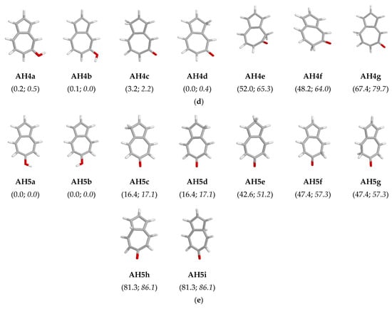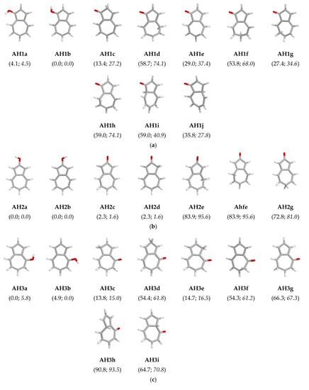 Similar to naphthols, hydroxyazulenes (OH forms) contain only one labile proton that can move according to the keto-enol prototropic conversion from the exo OH group to the endo C atom (n-π conjugated with the O atom). As explained above, the number of possible keto (CH) isomers depends on the HO-position in the azulene skeleton and the number of conjugated sites in azulenol. Taking additionally rotation of the exo OH group about C–O bond into account, the following numbers of possible OH rotamers and CH isomers could be analyzed: ten, seven, nine, seven, and nine for 1- (AH1), 2- (AH2), 4- (AH3), 5- (AH4), and 6-hydroxyazulene (AH5), respectively (Figure S1 in Supplementary Materials). Note that for symmetrically substituted derivatives containing OH at 2- and 6-position, the enol rotamers (AH2a/AH2b and AH5a/AH5b) and some keto tautomers (AH2c/A2Hd, AH2e/AH2f, AH5c/AH5d, AH5f/AH5g, and AH5h/AH5i) have identical constitutional structures. For these azulenols, the number of isomers possessing different structures reduces to four and five, respectively. However, all possible isomers should be considered for estimation of their percentage contents in the isomeric mixtures of AH1–AH5.