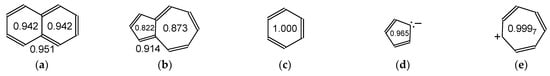 Using benzene as the reference molecule in the HOMED procedure, the structural indices have slightly lower values for the cyclopentadiene anion and cycloheptatriene cation (Figure 6), although full equalization of the CC bond lengths occurs for both ions. The decrease of HOMEDs can mainly result from slightly longer CC bonds in the cyclic ions than in neutral benzene. When the cyclopentadiene and cycloheptatriene ions are structurally fused to form the azulene system, the HOMEDs estimated for the individual rings are reduced to a higher degree than those for the benzene parts in naphthalene. Azulene presents weaker π-electron delocalization than naphthalene. One structural reason is that the C9C10 bond, common for the two cycles, is considerably longer in azulene (1.499 Å) than in naphthalene (1.431 Å). Lower aromatic stability of azulene than naphthalene has also been confirmed by applying other criteria of aromaticity, summarized in ref. [50].