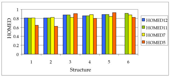 The HOMED indices estimates for unsubstituted azulene (structure 6) and for the five anionic forms A−1–A−5 (structures 1–5, respectively). HOMED5, HOMED7, HOMED11, and HOMED12 correspond to the five- and seven-membered rings, azulene system, and the entire molecule containing the CO bond.