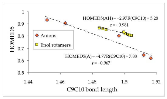 The linear relationships between the DFT-calculated C9C10 bond lengths (in Å) and HOMED5 indices for the anion forms and enol rotamers of hydroxyazulenes.
