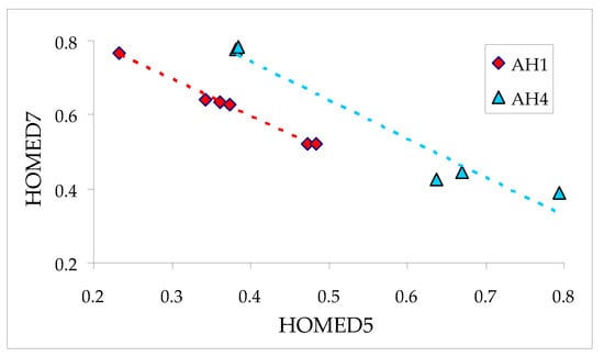 Linear tendencies between the HOMED7 and HOMED5 indices for selected keto isomers of azulenols AH1 and AH4.