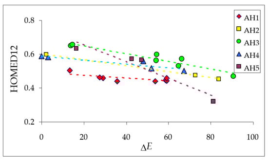 Variations of the HOMED11 and HOMED12 indices estimated for the keto tautomers of all azulenols are not so large as those of the HOMED5 and HOMED7 descriptors. Moreover, they change in the same small ranges (from 0.44 to 0.66), indicating that the C=O group included in the entire molecule (12 bonds) does not significantly affect electron delocalization in the azulene system containing 11 bonds. When the HOMED12 values are compared to the relative electronic energies (∆E in Figure 5), both calculated for the keto tautomers optimized at the DFT level, interesting parallelism can be observed for isomers of each derivative, AH1–AH5. These linear tendencies given in Figure 10 shed new light on some kind of symmetry (analogy) between electron delocalization (measured by HOMED) and acid-base properties of the conjugated tautomeric functions (measured by ∆E).