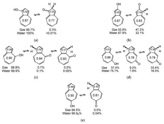 The favored keto and enol tautomers for 1- (a), 2- (b), 4- (c), 5- (d), and 6-hydroxyazulene (e). HOMED5s and HOMED7s are placed in the rings. The percentages contents of isomers in vacuo and aqueous solution are included below structures.