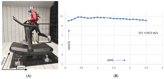 The left photo of Figure 2 shows the layout of the treadmill with the runner in the horizontal section of the wind tunnel. On the right side of Figure 2, a diagram of the local velocity at the PCN location, in the horizontal direction of the wind tunnel at the treadmill position, depending on the vertical position y. The velocity was measured using a Schiltknecht MiniAir 20 anemometer (Schiltknecht Messtechnik AG, Gossau/ZH). The flow velocity was measured at 1 m from the treadmill entry in the airflow direction of the meridian plane, which was positioned on the longitudinal axis of the treadmill.
