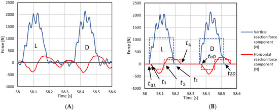 Figure 4 presents a typical example of the load of a runner on a treadmill. The diagram presents a snapshot from the measured time series, capturing loads of the left (L) and right (R) feet at any selected stride length . A detailed description of the course of the forces’ time signals is presented below with the kinesiological results of the runner’s movement on the treadmill. Down below, the equations for calculation of the running parameters are listed: