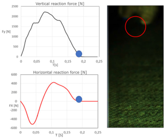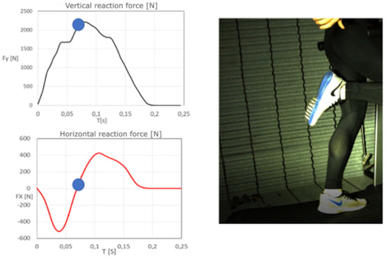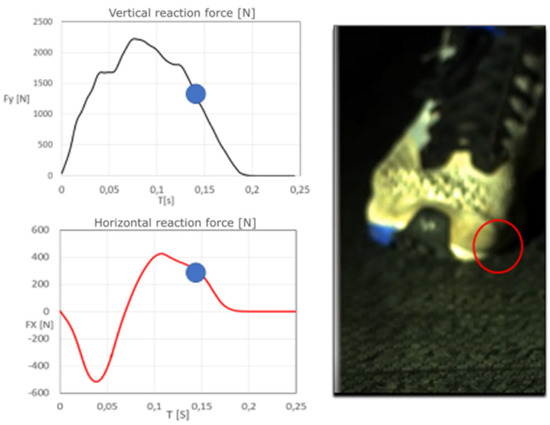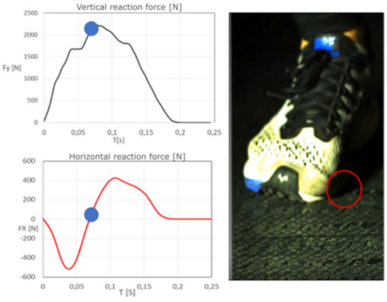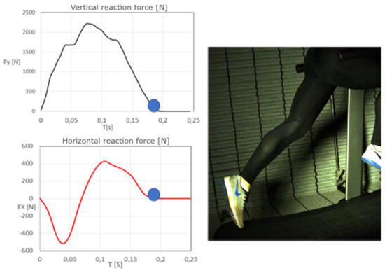 Based on the analysis of Figure 5 through Figure 8, the kinematics of a runner’s right foot, during the contact phase, can be determined in the frontal view. Figure 5 captures the moment that the runner’s foot touches the running belt. This moment is part of the initial contact phase. As such, a vertical force appears on the sensors, which decreases to a value of 0 in Figure 8 via the extreme of the Fx force in Figure 6, when the contact phase is completed. In turn, in Figure 9, Figure 10, Figure 11 and Figure 12, we can track the transfer of foot load from the heel, over the entire foot, through to the take-off phase, which ends on the front of the foot. In doing so, the leg is again extended in the ankle, knee, and hip joints. The analysed contact phase was selected from the captured running segment when the airflow velocity in the wind tunnel was equal to v = 0. Each of the images consist of a snapshot of the foot on the running belt and the corresponding value of the vertical force Fy, and the horizontal force Fx, which is marked for a given time series by a point on the diagram of forces Fx(t) and Fy(t). In this section of the analysis, we focused on the momentary position of the foot on the running belt and the corresponding values of the forces that represent the foot reaction forces onto the belt. The curves in each figure represent the course of the Fx and Fy reaction forces on the running surface, as measured by the built-in sensors during the time interval of the stride, consisting of the right foot’s take-off from the belt. The red curve illustrates the Fy reaction force’s course in the vertical direction, and the blue curve represents the course of the horizontal Fx reaction force. Each of these curves represents the momentary sum of the measured values: the red curve—the sum of four values in the vertical direction, calculated according to Equation (1); the blue curve—the sum of the forces, calculated according to Equation (2), in the horizontal wind tunnel. Points on the diagrams of the momentary force values that belong to the displayed image are shown next to the diagrams.