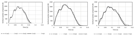 As opposed to the course of the vertical forces, as seen in Figure 13, a significant influence of the airflow velocity in the wind tunnel can be observed on running dynamics. This association is apparent along the course of the horizontal force (Figure 14) during the contact phase. In the case of headwind airflow, the braking phase of the runner is shorter. The gradient of increase of the horizontal force, on the other hand, is greater. The maximum forces at take-off are greater than in the case of running with a backwind.