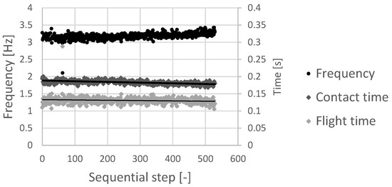 Step frequency, contact times, and flight phases as functions of the time sequence of running.