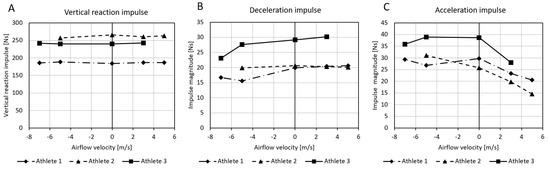 Time-averaged forces in vertical and horizontal directions: (A)—Fy, (B)—force Fx during the braking phase, (C) force Fx during the acceleration phase, at different airflow velocities, and running Athletes 1, 2, and 3.