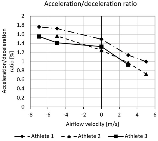 All of the runners are characterised by a descending curve, from high wind speeds to the chest (+8 m/s) to the lowest values of the ratio and high backwinds (−5 m/s). From the curve courses of the diagram shown in Figure 17, the ratio of “useful force” represented by the acceleration force relative to the braking force is reduced.